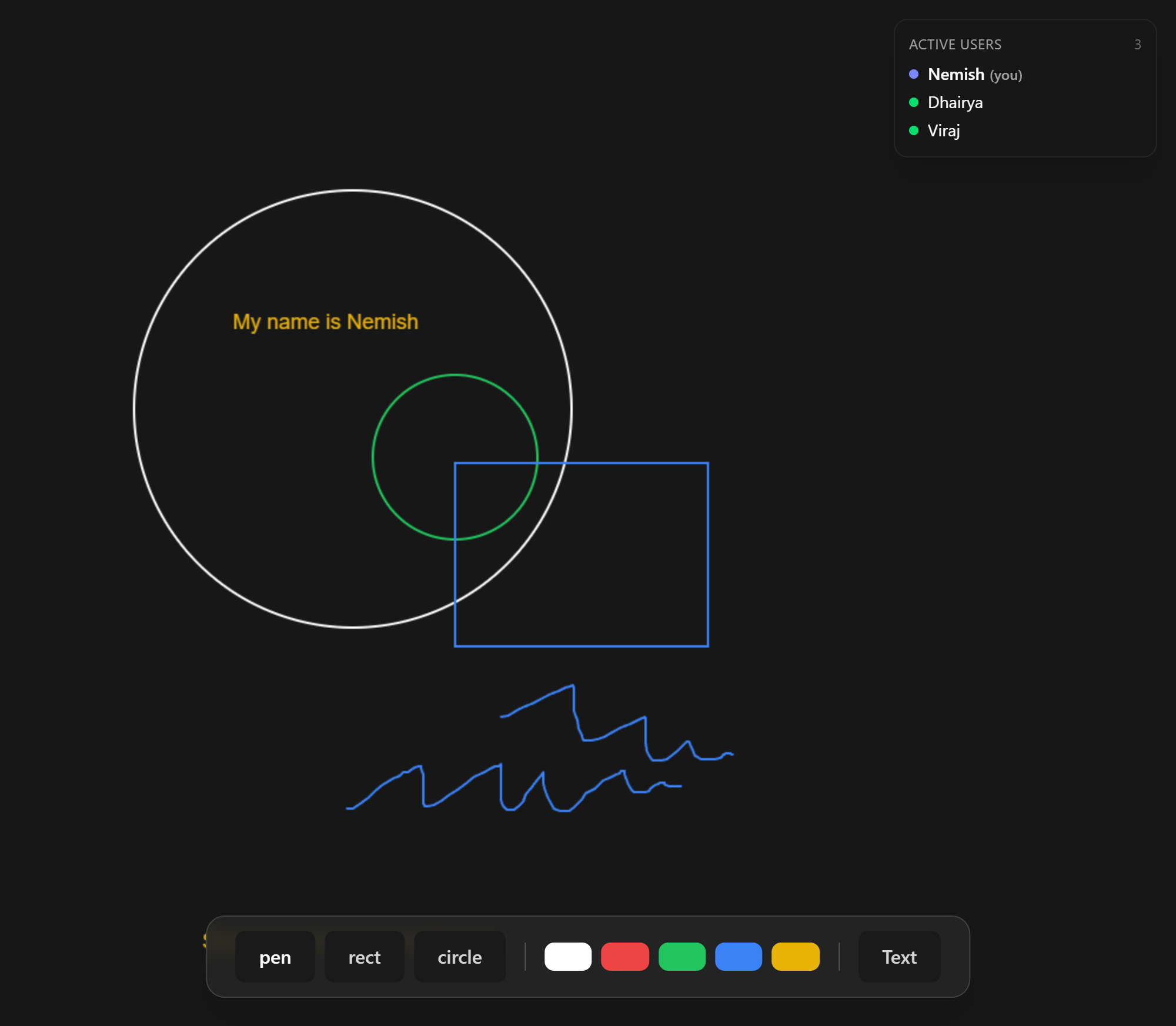 - 🖊️ Real-time Drawing: Live pen, shapes and text syncing across all connected users